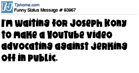 X I'm waiting for Joseph Kony to make a YouTube video advocating against jerking off in public.