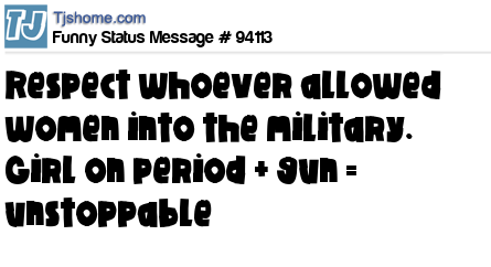 - # 106242 I respect whoever allowed women into the military. Girl on period + gun = unstoppable.