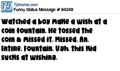 X says Watched a boy make a wish at a coin fountain. He tossed the coin & missed it. Missed. An. Entire. Fountain. Ugh, this kid sucks at wishing.