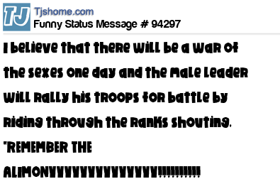 X I believe that there will be a war of the sexes one day and the male leader will rally his troops for battle by riding through the ranks shouting, "REMEMBER THE ALIMONYYYYYYYYYYYYYY!!!!!!!!!!