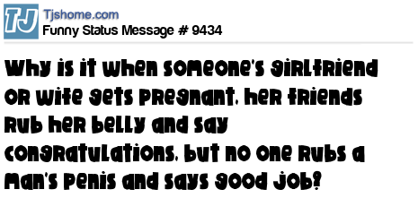 - # 163889 Why is it that when you get a woman pregnant, everyone rubs her belly saying "congratulations" but nobody ever rubs your junk and says "good job"?