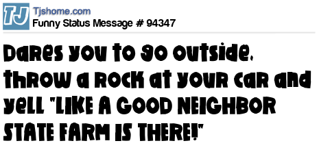 X is Dares you to go outside, throw a rock at your car and yell "LIKE A GOOD NEIGHBOR STATE FARM IS THERE!"