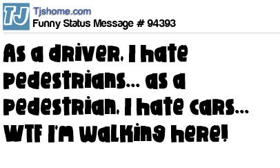 X says As a driver, I hate pedestrians... as a pedestrian, I hate cars... WTF I'm walking here!