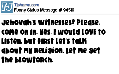 X is Jehovah's Witnesses? Please, come on in. Yes, I would LOVE to listen, but first let's talk about MY religion. Let me get the blowtorch.