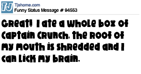 - # 94786 I love Captain Crunch,,, and by that I mean I can't get enough of tasting the "roof of my mouth" skin... Two more bowls till I can tongue my brain.