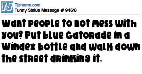 X is Want people to not mess with you? Put blue Gatorade in a Windex bottle and walk down the street drinking it.