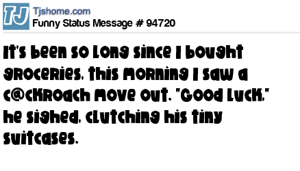 - # 94718 It's been so long since I bought groceries, this morning I saw a cockroach move out. "Good luck," he sighed, clutching his tiny suitcases.