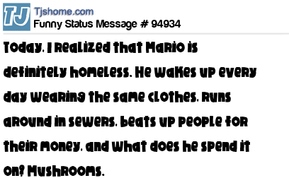 X Today, I realized that Mario is definitely homeless. He wakes up every day wearing the same clothes, runs around in sewers, beats up people for their money, and what does he spend it on? Mushrooms.