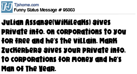 X  Julian Assange(Wikileaks) gives private info. on corporations to you for free and he's the villain. Mark Zuckerberg gives your private info. to corporations for money and he's Man of The Year.