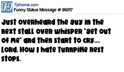 X Just overheard the guy in the next stall over whisper "get out of me" and then start to cry.... Lord, How I hate Turnpike rest stops.