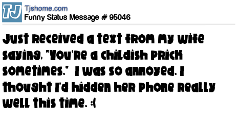 - # 96224 Just received a text from my wife saying, "You're a childish prick sometimes." I was so annoyed. I thought I'd hidden her phone really well this time.