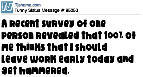 - # 140356 A recent survey of one person reveals that 100% of me thinks I should leave work early.