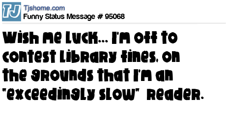 X Wish me luck... I'm off to contest library fines, on the grounds that I'm an "exceedingly slow" reader.