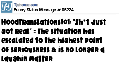 - # 98352 #HoodTranslations101: "Sh*t just got real" = The situation has escalated to the highest point of seriousness & is no longer a laughin matter