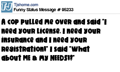 X A cop pulled me over and said "I need your license, I need your insurance and I need your registration!" I said "What about ME & my NEEDS!?"