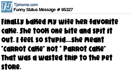 X is Finally baked my wife her favorite cake. She took one bite and spit it out. I feel so stupid....she meant "Carrot Cake" not " Parrot Cake" That was a wasted trip to the pet store.