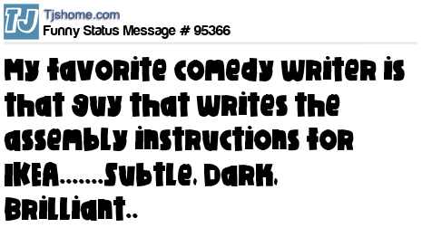 X My favorite comedy writer is that guy that writes the assembly instructions for IKEA.......Subtle, Dark, Brilliant..