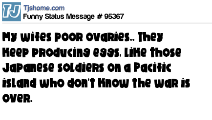 X My wifes poor ovaries.. They keep producing eggs, like those Japanese soldiers on a Pacific island who don't know the war is over.
