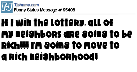 - # 209399 You know me. If I ever win the lottery, rest assured nobody around me will be poor and I mean that. I will move to a rich neighborhood.