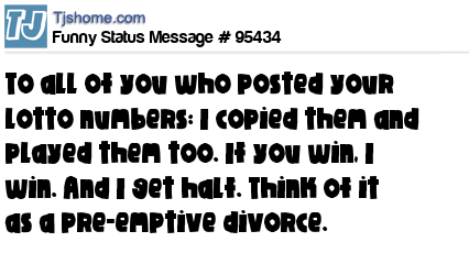 X is To all of you who posted your lotto numbers: I copied them and played them too. If you win, I win. And I get half. Think of it as a pre-emptive divorce.