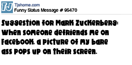 - # 151738 Suggestion for Mark Zuckerberg: When someone defriends me on Facebook, a picture of my bare butt pops up on their screen