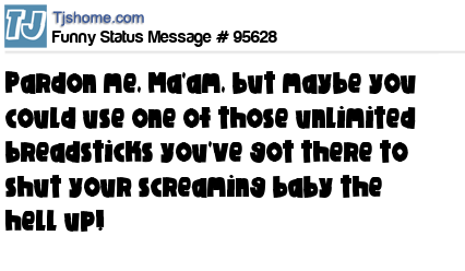 X Pardon me, Ma'am, but maybe you could use one of those unlimited breadsticks you've got there to shut your screaming baby the hell up!