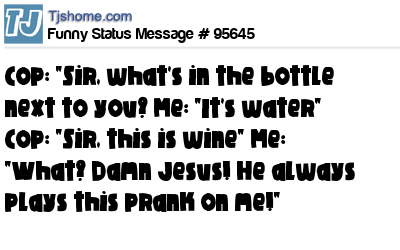 X says Cop: "Sir, what's in the bottle next to you? Me: "It's water" Cop: "Sir, this is wine" Me: "What? Damn Jesus! He always plays this prank on me!"