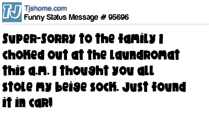 X Super-Sorry to the family I choked out at the laundromat this a.m. I thought you all stole my beige sock. Just found it in car!