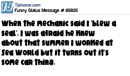 - # 207988 When the mechanic said I 'blew a seal', I was afraid he referring about that summer I worked at Sea World but it turns out it's some car thing. ðŸ¤