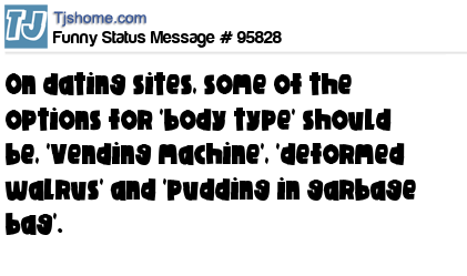 X On dating sites, some of the options for 'body type' should be, 'Vending machine', 'deformed walrus' and 'pudding in garbage bag'.