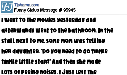 X is I went to the movies yesterday and afterwards went to the bathroom. In the stall next to me, some mom was telling her daughter, "Do you need to go tinkle tinkle little star?" And then she made lots of peeing noises. I just left the bathroom as fast as I c