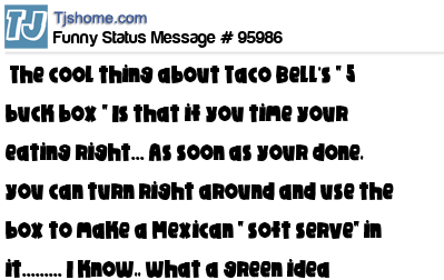X The cool thing about Taco Bell's " 5 buck box " Is that if you time your eating right... As soon as your done, you can turn right around and use the box to make a Mexican " soft serve" in it......... I know,, what a green idea