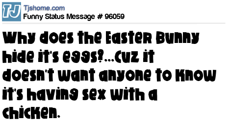 - # 17259 thinks the only reason the Easter bunny hides his eggs is cause he doesn't want anyone to know he screwed a chicken.