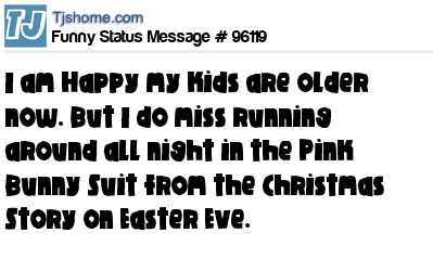 X I am Happy my kids are older now. But I do miss running around all night in the Pink Bunny Suit from the Christmas Story on Easter Eve.