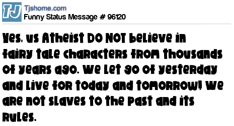 X says Yes, us Atheist DO NOT believe in fairy tale characters from thousands of years ago. We let go of yesterday and live for today and tomorrow! We are not slaves to the past and its rules.