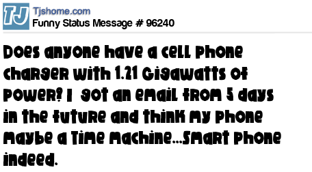 X is Does anyone have a cell phone charger with 1.21 Gigawatts of power? I  got an email from 5 days in the future and think my phone maybe a Time machine...Smart phone indeed.
