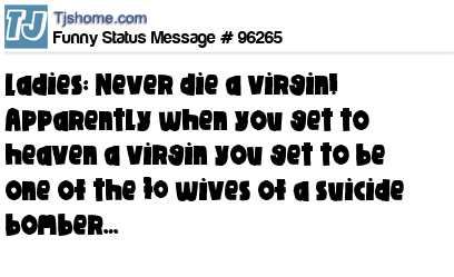 - # 96124 Ladies; Never die a virgin, apparently when you get to heaven they make you shag a suicide bomber.