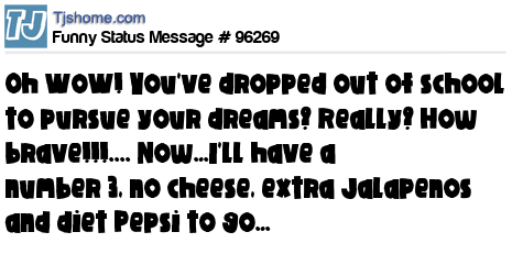 X is Oh WoW! You've dropped out of school to pursue your dreams? Really? How brave!!!.... Now…I'll have a number 3, no cheese, extra Jalapenos and diet Pepsi to go…