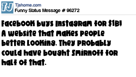 X  Facebook buys Instagram for $1B! A website that makes people better looking. They probably could have bought Smirnoff for half of that.