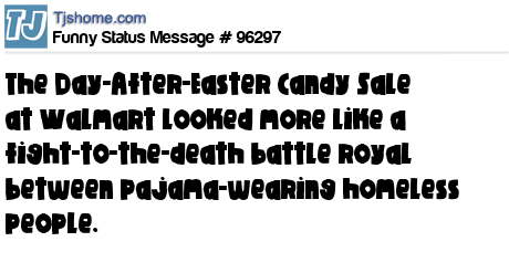 - # 205222 The Day-After-Easter Candy Sale at Walmart is currently looking like a fight-to-the-death battle Royal between the all day Pajama People vs the Sweat Pants crowd.