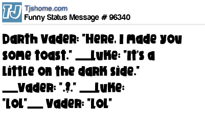 X Darth Vader: "Here, I made you some toast." ___Luke: "It's a little on the dark side." ___Vader: ".?." ___Luke: "Lol"___ Vader: "Lol"
