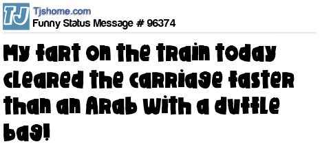 X says My fart on the train today cleared the carriage faster than an Arab with a duffle bag!