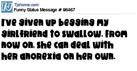 X says I've given up begging my girlfriend to swallow. From now on, she can deal with her anorexia on her own.