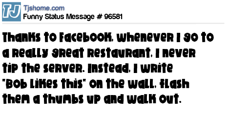 X Thanks to Facebook, whenever I go to a really great restaurant, I never tip the server. Instead, I write "Bob likes this" on the wall, flash them a thumbs up and walk out.