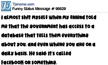 X I almost sh!t myself when my friend told me that the government has access to a database that tells them everything about you, and even where you are on a daily basis. He said: It's called Facebook or something.