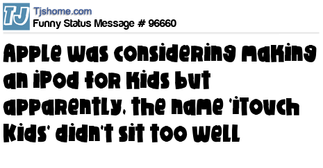 - # 23026 I've heard that Apple have scrapped their plans for the new children's iPod after realizing that iTouch Kids is not a good product name.