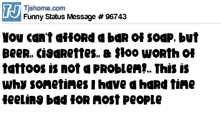 X You can't afford a bar of soap, but Beer,, Cigarettes,, & $700 worth of tattoos is not a problem?.. This is why sometimes I have a hard time feeling bad for most people