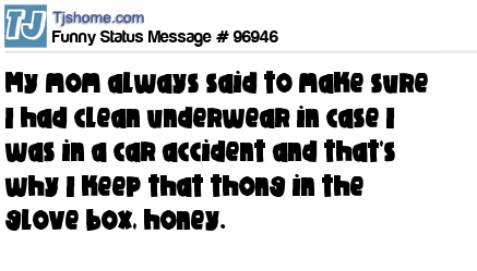 X My mom always said to make sure I had clean underwear in case I was in a car accident and that's why I keep that thong in the glove box, honey.