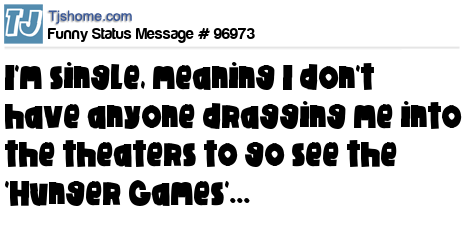 X is I'm single, meaning I don't have anyone dragging me into the theaters to go see the 'Hunger Games'...