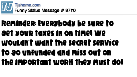 X Reminder: Everybody be sure to get your taxes in on time! We wouldn't want the secret service to go unfunded and miss out on the important work they must do!